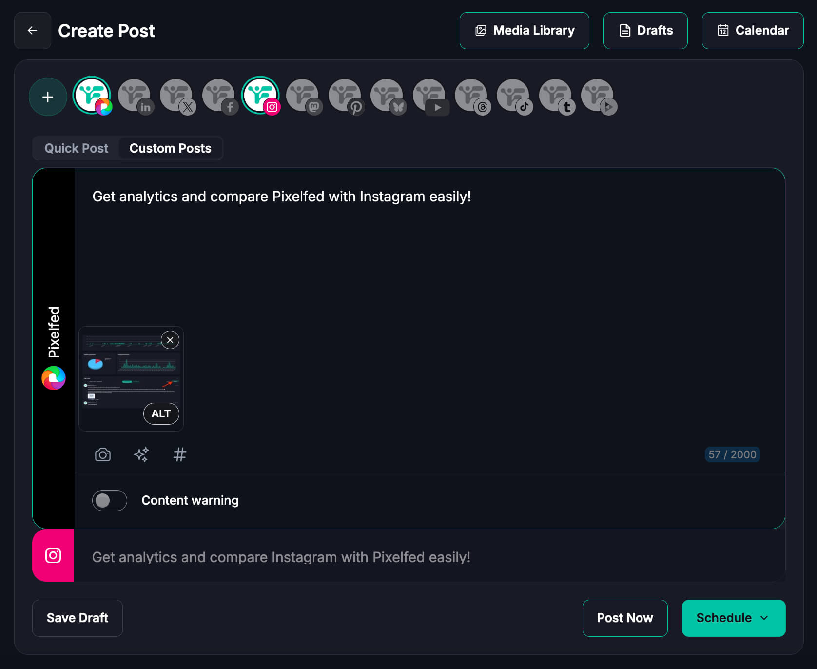 نعم. تدعم فيديكا التخطيط متعدد المنصات، مما يتيح لك تخصيص المحتوى لكل شبكة مع الحفاظ على استراتيجية واحدة.