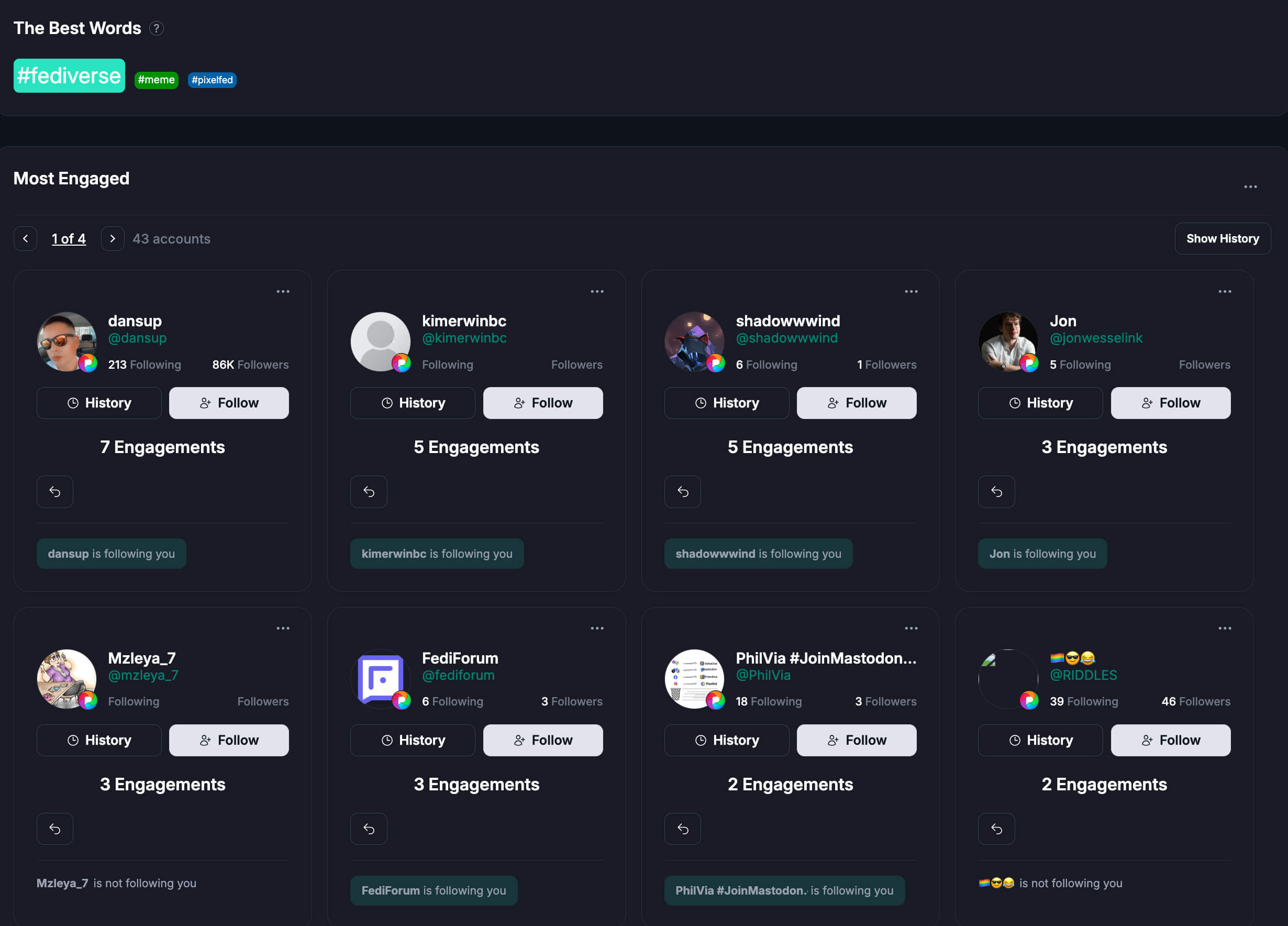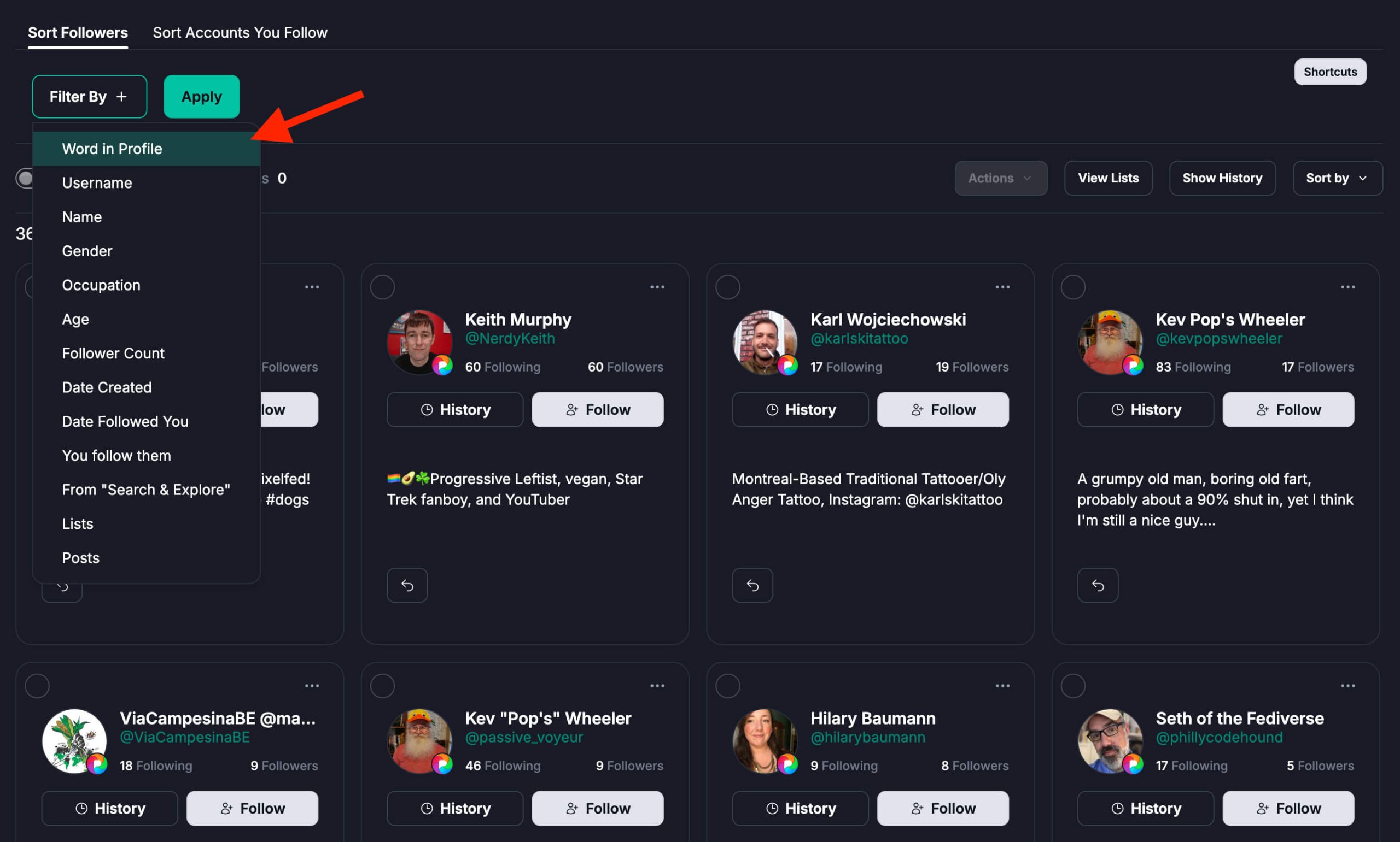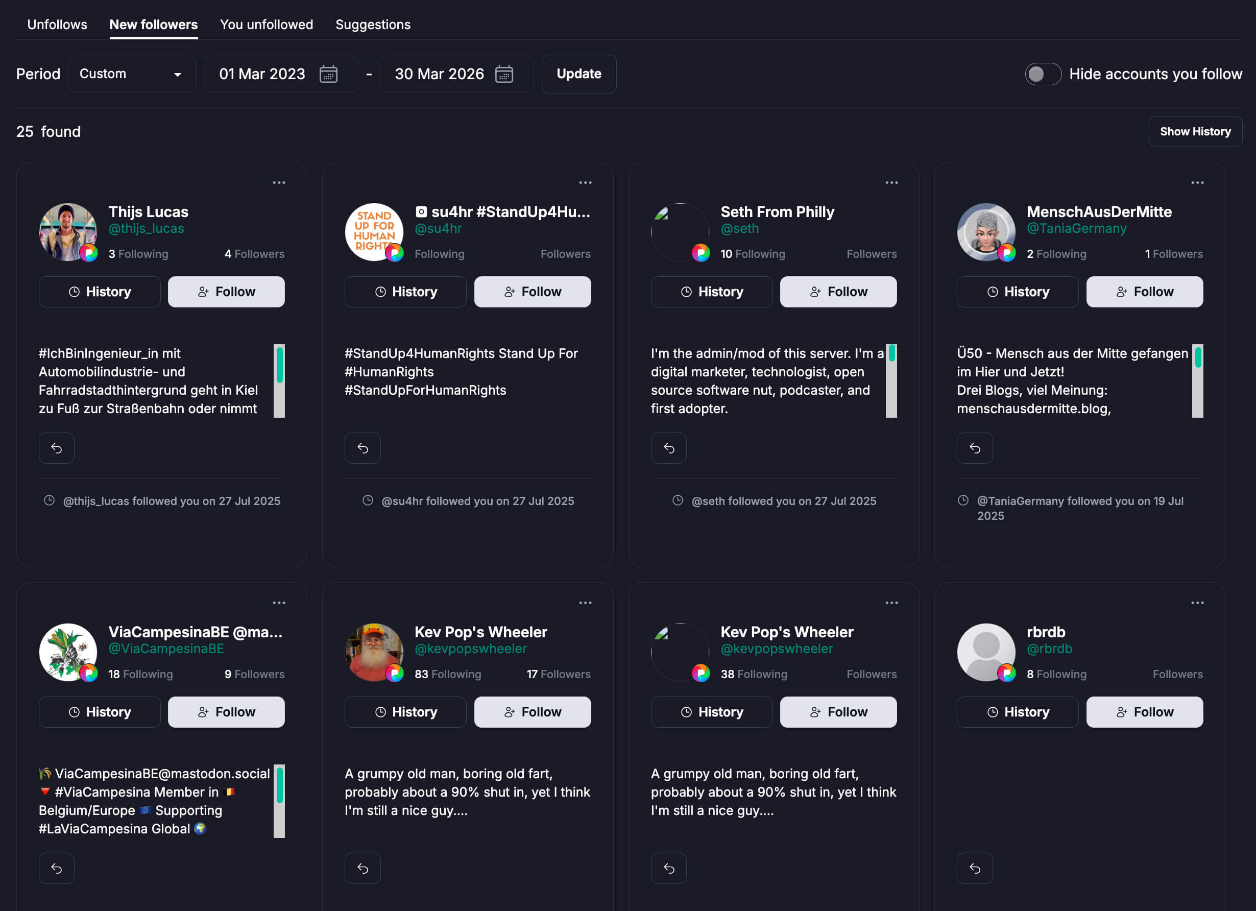 تتبّع تغييرات المتابعين، ورتّب الحسابات، وركّز على التفاعل النوعي. أنشئ قوائم، وحدّد أكثر المتفاعلين لديك تفاعلاً، وحافظ على رؤية واضحة لاتجاهات النمو بمرور الوقت. افهم جودة الجمهور، وتغييرات النمو، ومن يقود التفاعل.