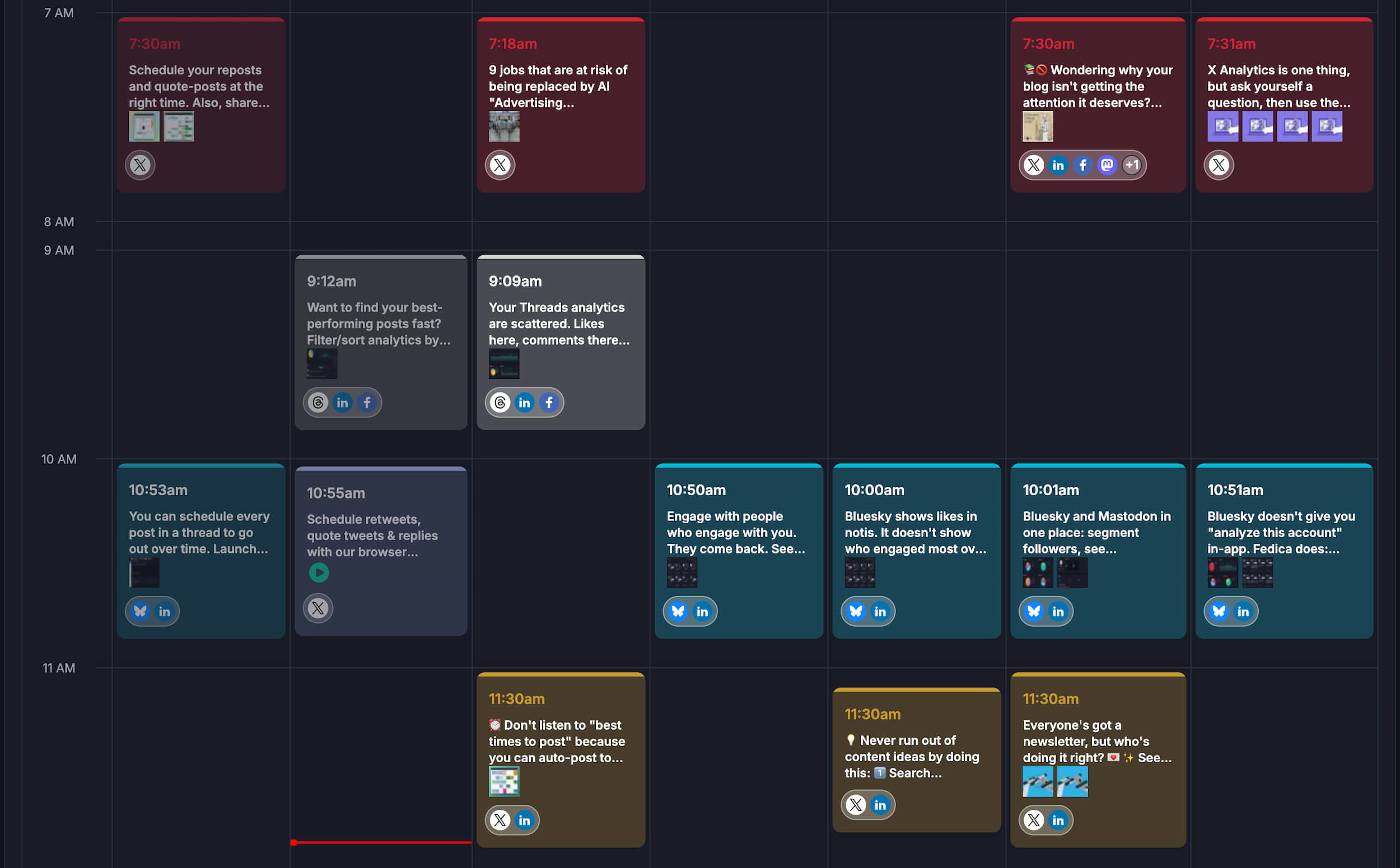 استخدم أداة جدولة بلوسکاي لجدولة منشورات بلوسکاي وإعادة نشرها على ماستودون وثريدز وبكسلفد وانستغرام وX وينكدين من تقويم واحد. ستكون منشوراتك أصلية على كل شبكة، ومخصصة لكل منصة، وليست مجرد إعادة نشر. قم بالإشارة إلى الأشخاص وخصص رسالتك لكل جمهور لتحقيق أعلى مستوى من التفاعل.