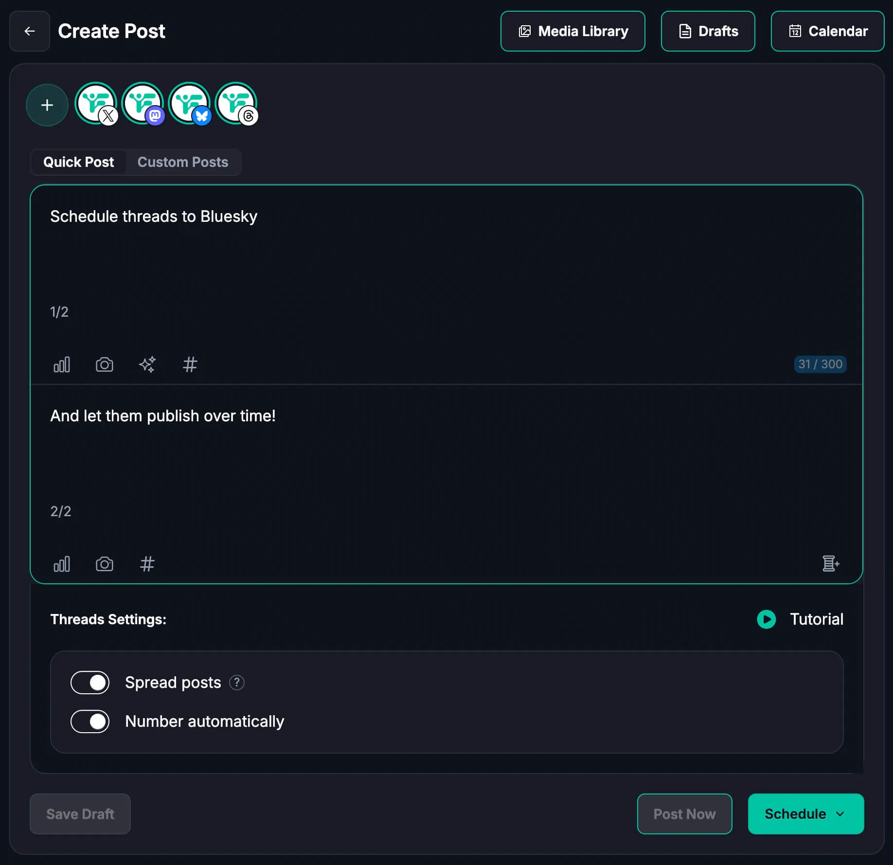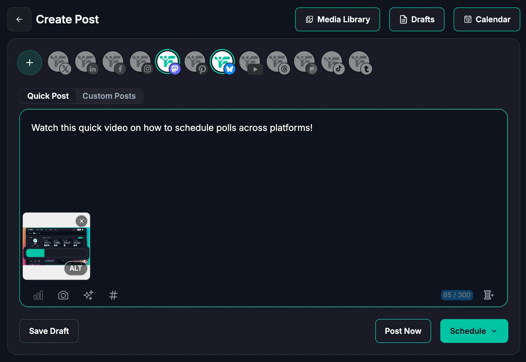 انشر على منصات بلوسکاي وماستودون وبكسلفد وثريدز وينكدين من مكان واحد. جدوِل استطلاعات الرأي ومنشورات المواضيع والوسائط. استخدم مُجدوِل محتوى بلوسکاي لجميع أنواع المحتوى.
