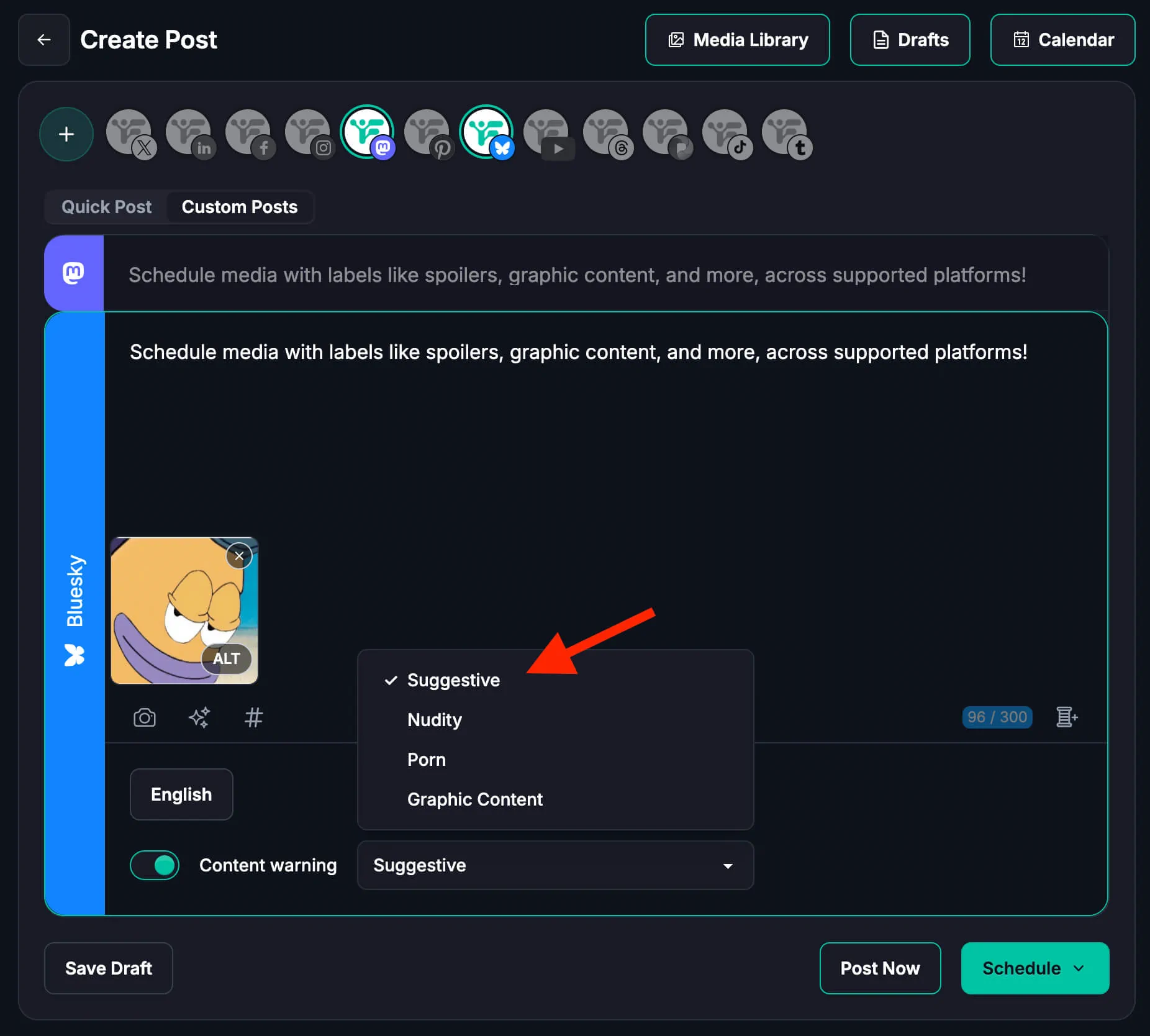 يُتيح بلوسکاي نطاقًا واسعًا من المحتوى عند تصنيفه بشكل صحيح. في مُجدول المنشورات، يُمكنك إضافة تصنيفات تحذيرية للمحتوى: محتوى مُوحٍ، عُري، محتوى للبالغين، محتوى صادم، لضمان توافق منشوراتك مع القواعد. يُفيد هذا التصنيف في التعامل مع المحتوى المُوحي، والمحتوى الذي يكشف أحداثًا مهمة، والمحتوى الصادم. لا مجال للالتباس؛ فالتصنيف الواضح يُحافظ على سلامة حسابك.