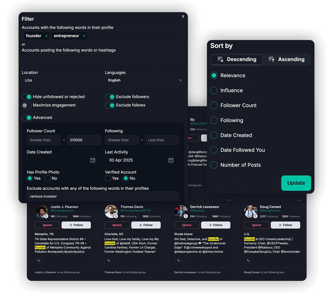 - Identify influencers in your niche by filtering follower counts and engagement rates.