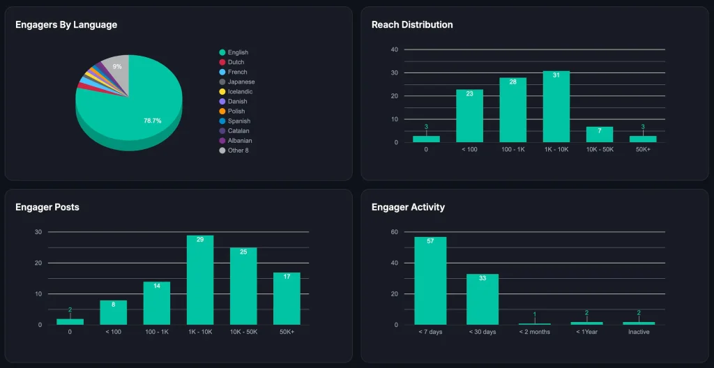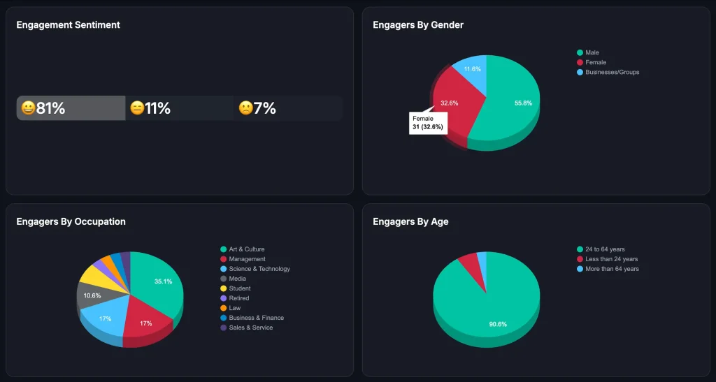 Fedica’s engagement dashboard shows who engages and what topics resonate, with filterable analytics and segmentation tied to your pipeline planning. For X specifically, you can also use follower data, including demographic filters, to refine which personas you are posting for.