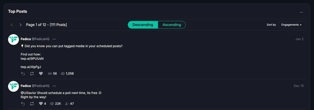 Then you can check analytics and audience response right away. If you expand beyond X, you can manage those networks in the same workflow, because Fedica is one of the best social media management tools.