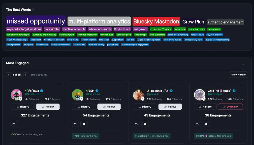 Fedica wins on analytics when you care about learning from X. You get engagement metrics and audience data that tie back to how you planned content in your calendar or just by filtering for keywords. Fedica’s analytics combine an engagement dashboard with segmentation, so you can see which topics and personas drive results. That makes it easier to decide what to repeat, stop, and target next.