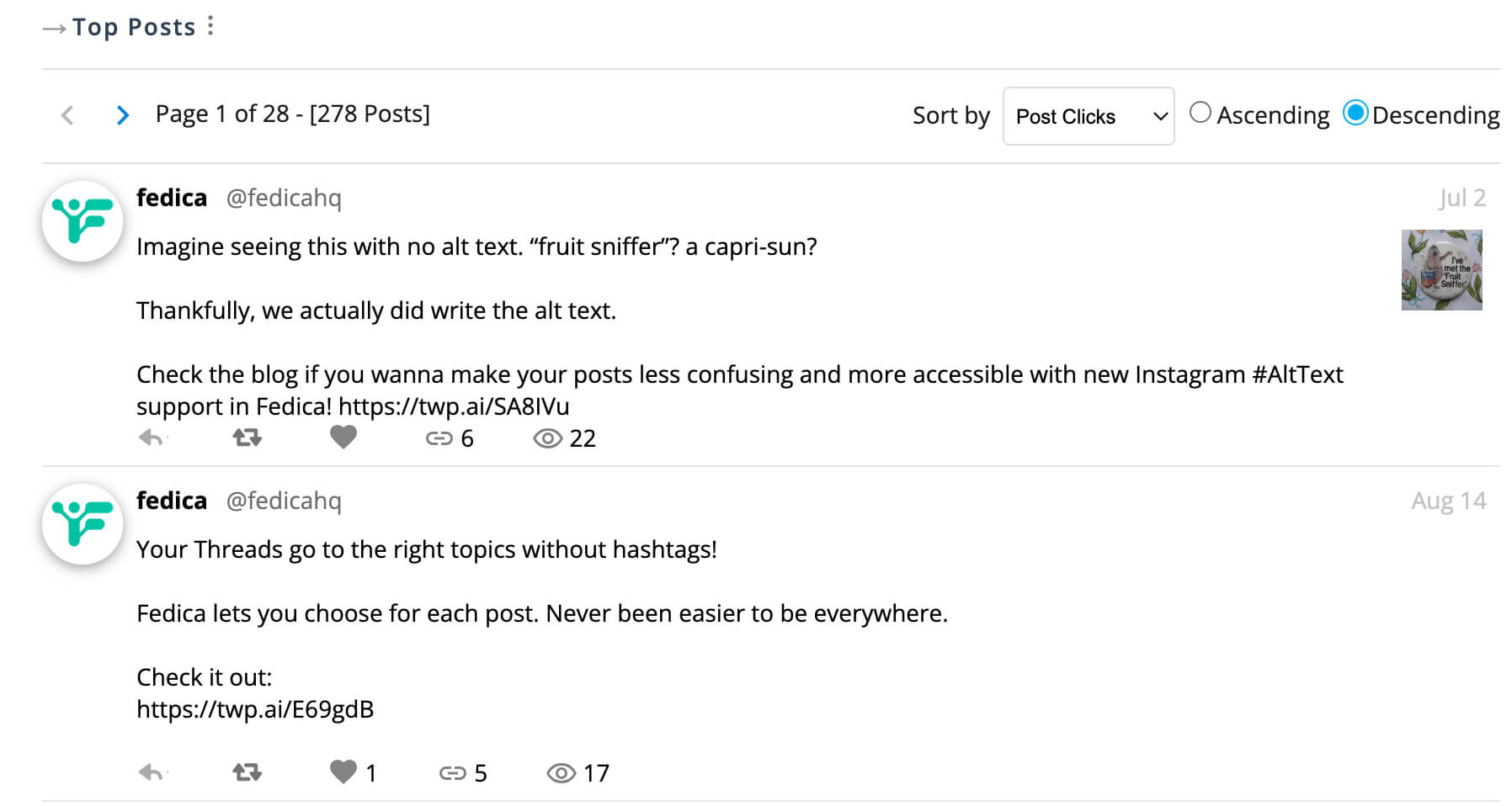 See every post listed in Fedica’s analytics with their link click counts. The dashboard shows all posts, engagements, and metrics in one place, making it easy to identify which content drives the most traffic to your website.
