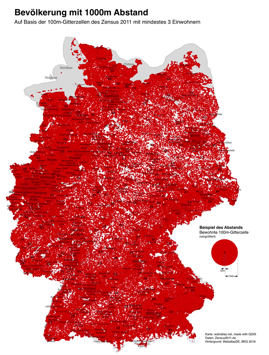 Suppose you wanted to build something in Germany that is at least 1km away from where people live, the coloured areas are a no.